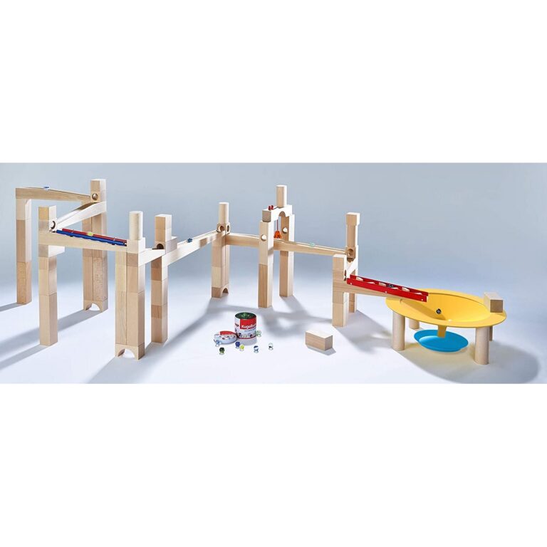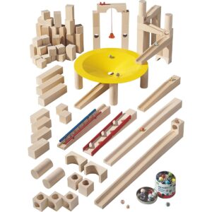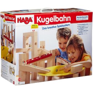 Pista delle biglie Kugelbahn – Super Kit. Il set più completo tra le piste Kugelbahn di HABA. Contenuto: 77 pezzi in legno di faggio – 1 imbuto di metallo “Vortice”, 1 scatola con 42 biglie di vetro e 2 biglie di metallo. Età: 3-10