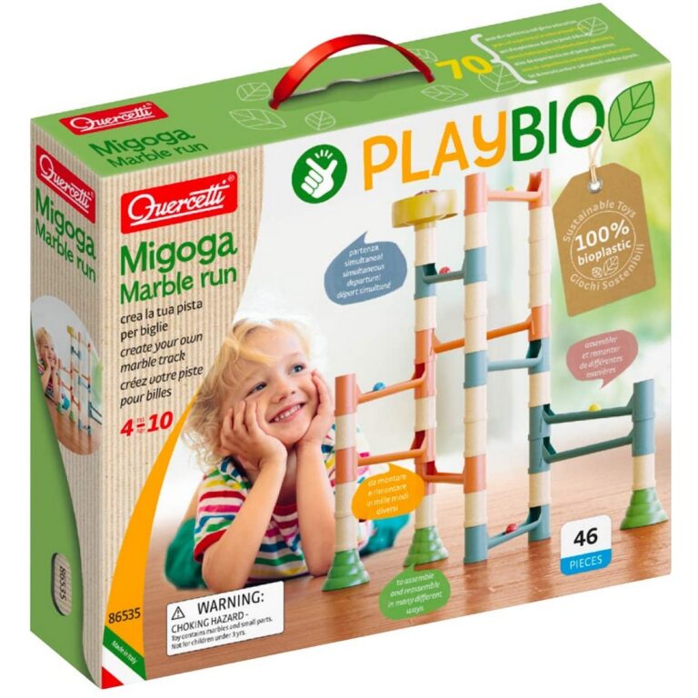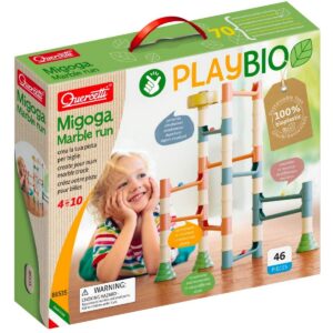 Una pista per biglie all’insegna del green. Nel kit sono presenti ben 49 pezzi per comporre solide strutture sempre diverse e stimolanti. Il bambino potrà combinare i diversi colori delle piste ed arricchirle con scivoli e mulinelli. Inoltre, utilizzando le biglie di vario colore si potrà osservare il loro percorso ed apprendere la forza di gravità. Migoga Marble Run sviluppa la creatività, il ragionamento ed il pensiero critico del bambino. Età: 3-6 anni - PLAY BIO è una linea di prodotti che si rivolge a genitori particolarmente attenti alla salvaguardia del benessere del pianeta, attraverso la selezione di materiale biodegradabile ed eco-friendly. Giochi ad incastro, piste e chiodini ideati per favorire lo sviluppo cognitivo e motorio dei bambini, utilizzando una speciale plastica bio ecosostenibile.