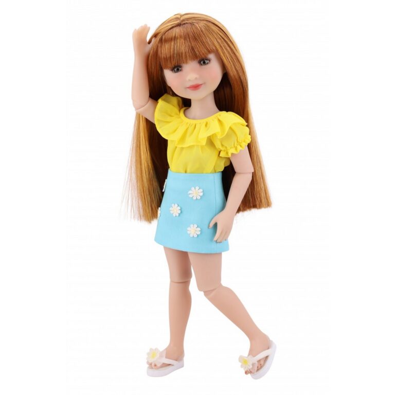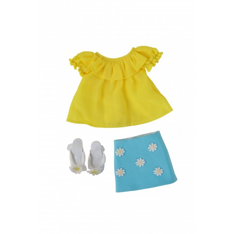 Outfit per bambole Ruby Red Fashion Friends (37 cm). È ora di portare il sole! Questo outfit è composto da un top giallo con scollo arricciato, una gonna azzurra con dettagli a margherita e un paio di freschi sandali margherita abbinati. Bambola non Inclusa