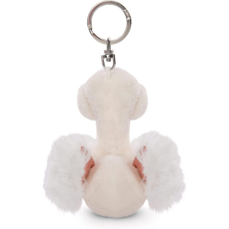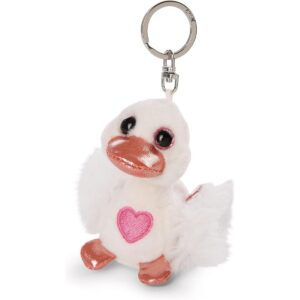 Cigno dell’Amore: Portachiavi NICI. Un tenero cigno bianco di peluche alto 8 cm, simbolo di amore e dolcezza. Presenta un becco e dei piedini rosa scintillanti e un cuore rosa ricamato sul petto. Grazie al pratico anello portachiavi in metallo, questo cigno è un piccolo e affettuoso compagno da portare sempre con te su chiavi, zaini o borse.