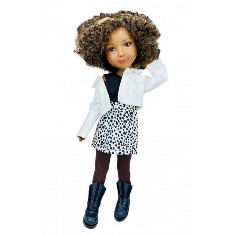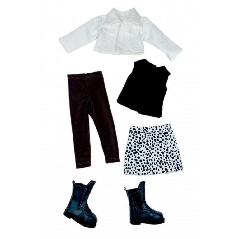 Outfit per bambole Ruby Red Fashion Friends (37 cm). Preparati per qualsiasi evento con la tua gonna Chic animalier preferita e la giacca di jeans bianca, abbinata a un top nero senza maniche, leggings e stivali. Bambola NON inclusa