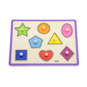 Puzzle in legno Viga, per bambini dai 18 mesi. Con 8 forme geometriche colorate e pomelli per facilitare la presa. Perfetto per sviluppare coordinazione occhio-mano, motricità fine e riconoscimento di forme e colori.