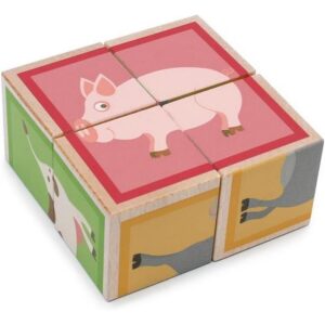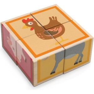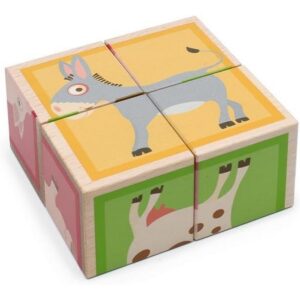 4 cubotti in legno, per comporre coloratissimi e divertenti animali della fattoria. Il gioco stimola il riconoscimento di forme e colori e la motricità fine.