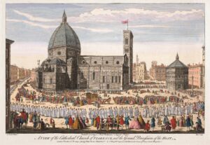 L’immagine raffigura Piazza del Duomo a Firenze durante la solenne processione del Corpus Domini, uno degli eventi religiosi più importanti dell’epoca. La scena è ricca di dettagli: il clero in abiti bianchi ordinato lungo il corteo, la nobiltà fiorentina con eleganti vestiti colorati, carrozze, cittadini comuni, bambini che giocano e persino cani che animano la piazza, offrendo uno spaccato autentico della vita urbana del XVIII secolo.