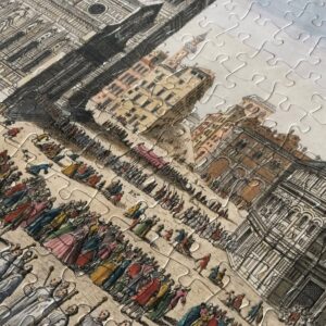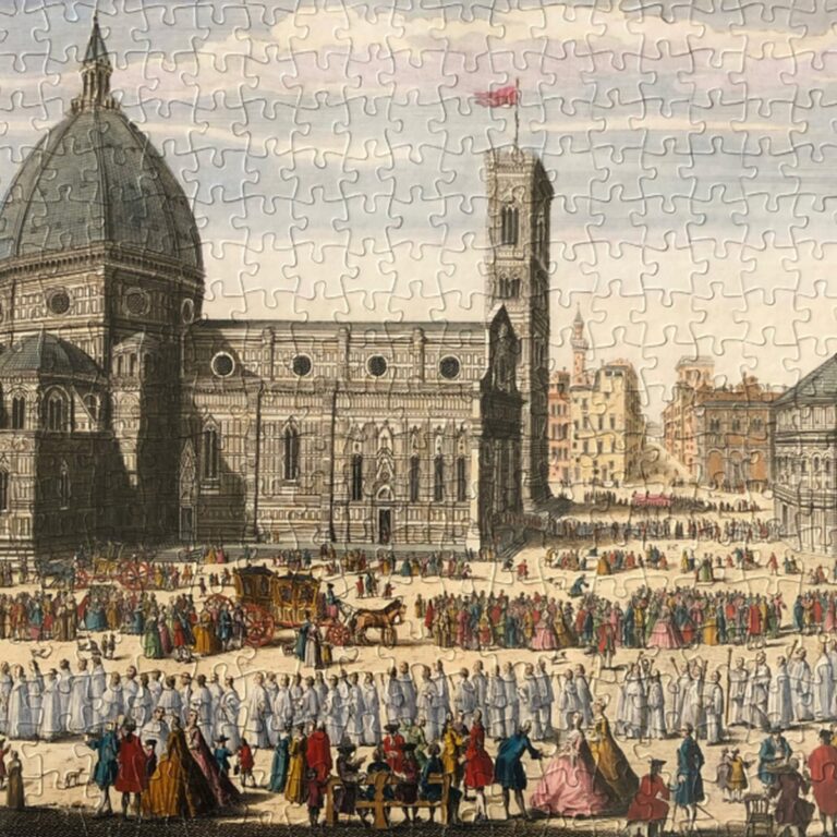Il Puzzle Duomo di Firenze Architoys riproduce una straordinaria incisione storica pubblicata nel 1750 da Robert Sayer, celebre incisore ed editore britannico, noto per le sue raffinate vedute urbane e rappresentazioni di città europee iconiche.
