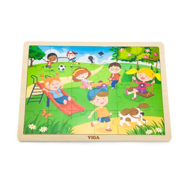 Celebra l'arrivo della bella stagione con il Puzzle in Legno Viga Primavera, un'attività allegra e stimolante per bambini dai 2 anni in su. Questo puzzle cattura la vivacità della primavera attraverso un'illustrazione colorata e dettagliata di bambini che giocano in un parco fiorito, con altalene, scivoli e palloni.