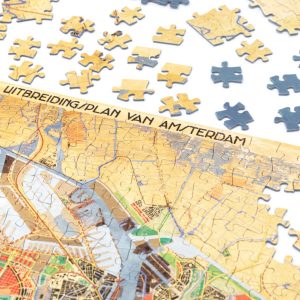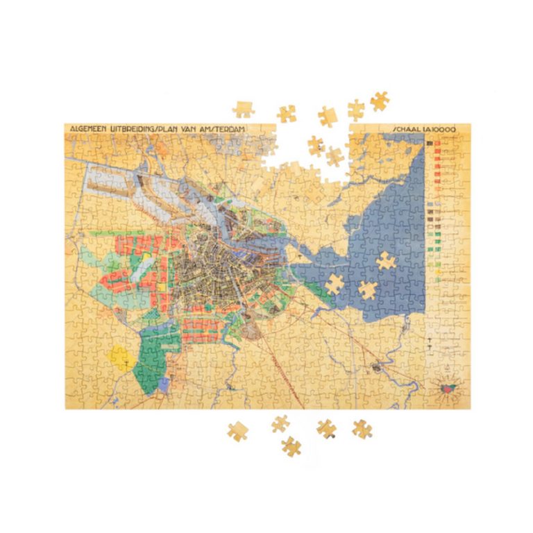Questo puzzle di alta qualità riproduce una mappa del "Piano Generale di Espansione" (Algemeen Uitbreidingsplan, o AUP), un progetto urbanistico fondamentale per la città di Amsterdam, redatto nel 1934 dal celebre architetto Cornelis van Eesteren.