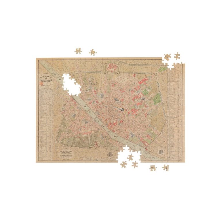Puzzle Firenze - La Pianta Topografica di Firenze, disegnata da Gaetano Auzzani, incisa da Giacinto Maina e curata da Giovanni Berni nel 1850, è un omaggio di alta qualità al "gonfaloniere molto meritevole della città di Firenze" Vincenzo Peruzzi.