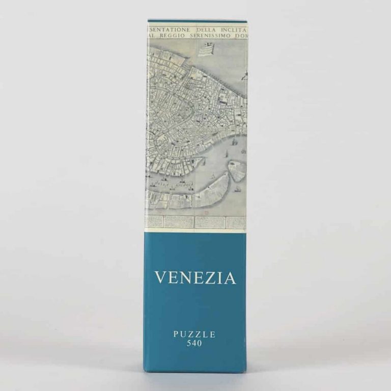 Puzzle Venezia - La mappa di Venezia di Lodovico Ughi, un documento originale di 128 x 177 cm del 1729, è un pezzo imponente di rilevanza artistica, scientifica e documentaria. Molto dettagliata, la mappa è composta da otto fogli, disposti su due file, che presentano, oltre alla pianta della città, una serie di elementi speciali: una grande rosa dei venti, una poesia di Jacopo Sannazaro nelle mani di un putto, un'allegoria di Venezia basata su un disegno di Sebastiano Ricci, una composizione con le insegne della famiglia Morosini e un'etichetta con la dedica dell'autore al doge Aloysio Mocenigo. Ai lati, sedici piccole vedute della città realizzate dal pittore Carlevarijs e infine, in basso, la descrizione della città.