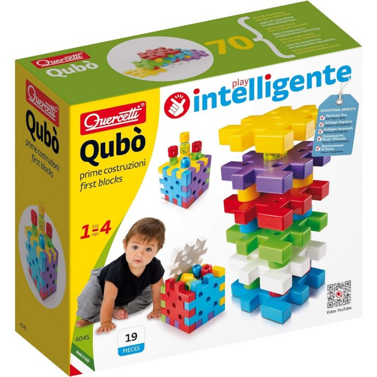 Qubo' è un gioco di costruzioni per i più piccoli formato da grandi piastre da incastrare o sovrapporre e da grandi chiodini in 4 forme da impilare in verticale come colonne o da infilare nei buchi.