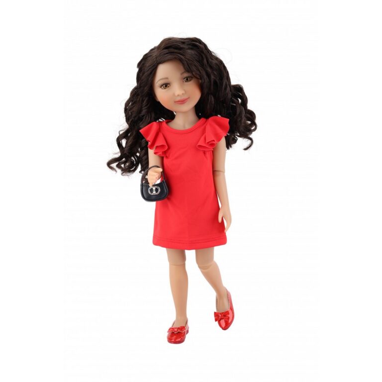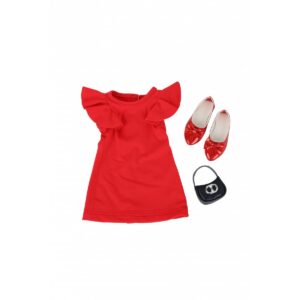 Outfit per bambole Ruby Red Fashion Friends (37 cm). La tua bambola sarà davvero molto elegante con questo favoloso outfit composto da mini abito rosso con maniche a volant, una sofisticata borsetta nera e un paio di décolleté glitterate rosse verniciate che brilleranno sotto i riflettori. Bambola non Inclusa