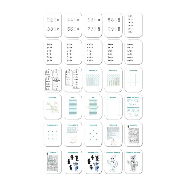 Come si usa: il bambino prende una delle schede e ricalca lettere, numeri, risolve calcoli semplici o gioca seguendo le istruzioni della carta. Può farlo da solo o sfidare un amico, imparando divertendosi.