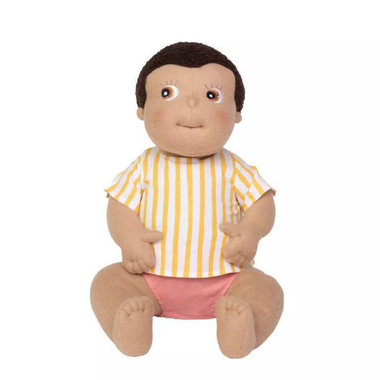 Baby Ben - Bambola di stoffa - Bambola empatica. Baby Ben è una bambola anatomicamente corretta che è stata sviluppata insieme ad esperti per aiutare i bambini a conoscere il proprio corpo, comprendere le emozioni e il mondo che li circonda attraverso il gioco. Il piccolo Ben di Rubens ha la pelle scura e i capelli castani. La bambola ha un corpo morbido ed è alta 45 cm e pesa 600 grammi. La pelle della bambola è realizzata al 100% in cotone biologico, certificato secondo l'Organic Content Standard (OCS) e ha un'imbottitura in 100% poliestere Global Recycled Standard (GRS) fibre. Età di gioco: 0 M +
