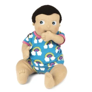 Con pelle chiara e capelli castani, Baby Morra è alta 45 cm e pesa 600 grammi, dimensioni ideali per le manine dei più piccoli. La bambola è realizzata con cotone biologico certificato OCS e imbottitura in poliestere riciclato certificato GRS, garantendo qualità, sostenibilità e attenzione all’ambiente.