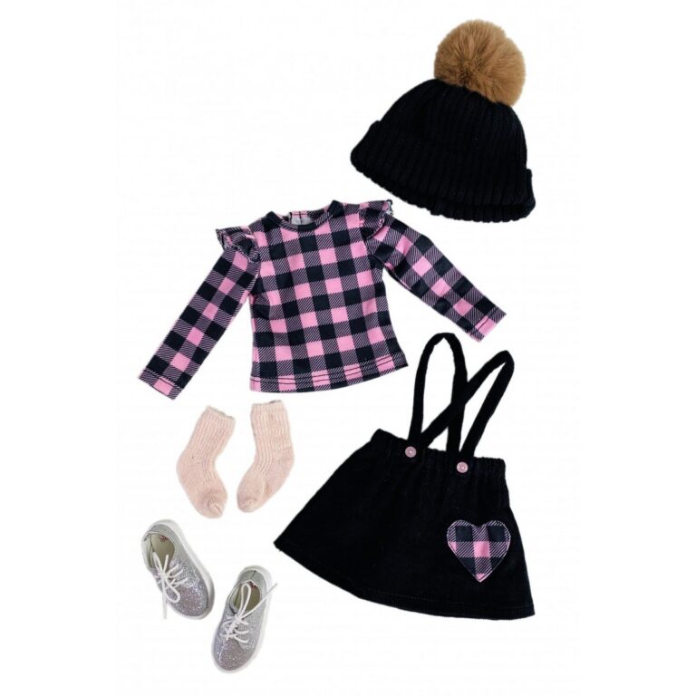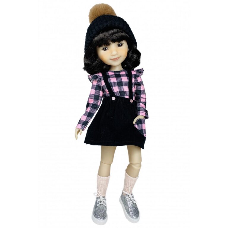 Outfit per bambole Ruby Red Fashion Friends (37 cm). La tua bambola sarà davvero molto elegante con questo favoloso outfit composto da maglione di velluto a coste con camicia a quadri rosa e nero, un cappello con pompon nero, gambaletti e scarpe scintillanti. Bambola non Inclusa