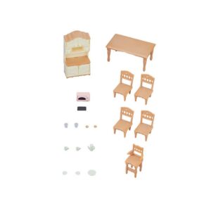 Sala da pranzo Sylvanian Families - Il set comprende: credenza, tavolo, 4 sedie, seggiolone, un servizio da tè e un forno tostapane che possono essere riposti nell'armadio della cucina. Personaggi non inclusi.