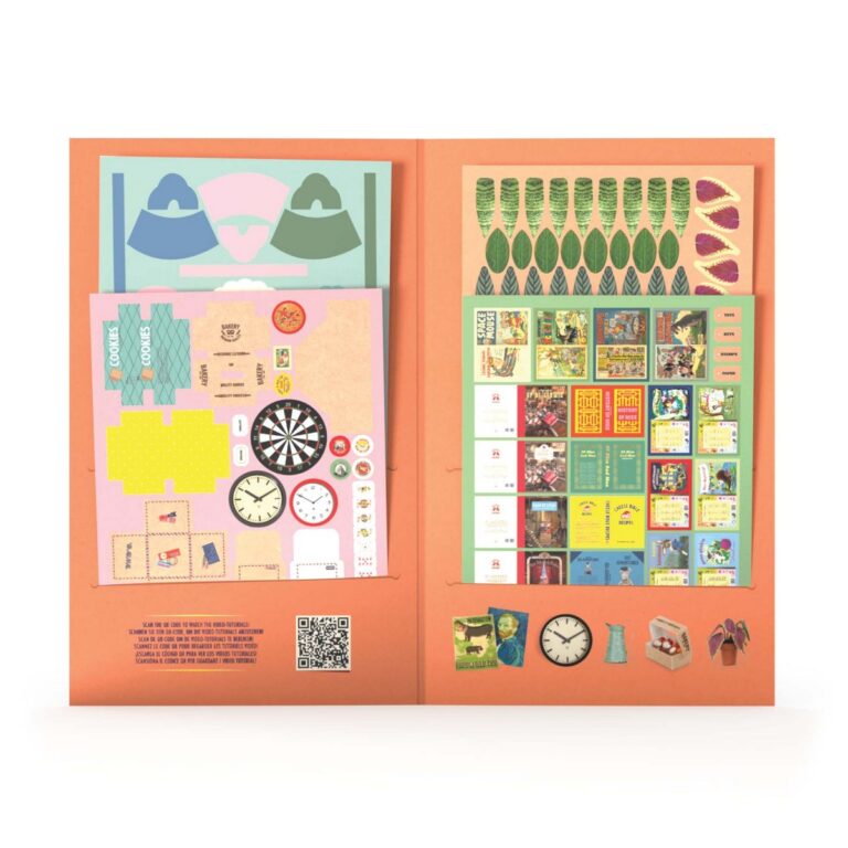 Crea miniature di carta per la Mouse Mansion con questo set di fustelle. Arreda soggiorno, camera, cucina, bagno, negozio e aula in scala 1:12, realizzando accessori, orologi, scatole, lampade e persino dentifricio. Adatto dai 6 anni.
