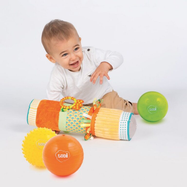 Scatola giochi sensoriali - Una set regalo composto da giocattoli che accompagnano il bambino nella scoperta dei sensi e nello sviluppo delle sue capacità motorie. Composto da 1 rullo gonfiabile con texture diverse e 3 palline sensoriali dai colori vivaci. Dimensioni tubo sensoriale: altezza 40 cm, diametro tubo 10 cm. Diametro palline: 13 cm - Età: +6M