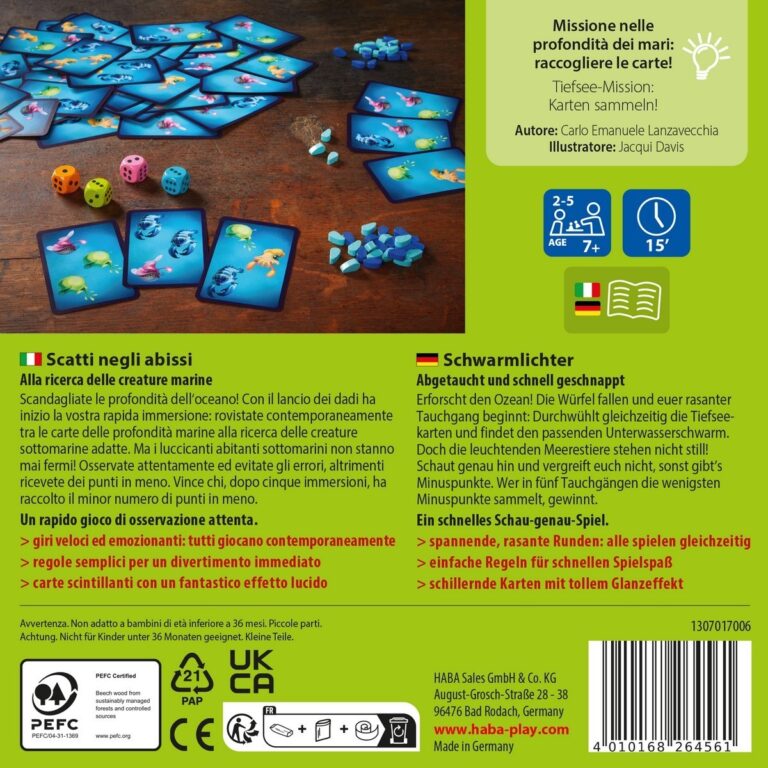 Scandagliate le profondità dell'oceano. Con il lancio dei dati avrà inizio la vostra rapida immersione: rovistate contemporaneamente nelle carte delle profondità dell'oceano alla ricerca di creature marine. Ma i luccicanti abitanti marini non stanno mai fermi! Osservate attentamente per evitare glia errori, altrimenti riceverete punti in meno. Vince chi dopo cinque immersioni ha ricevuto il minor numero di punti in meno.