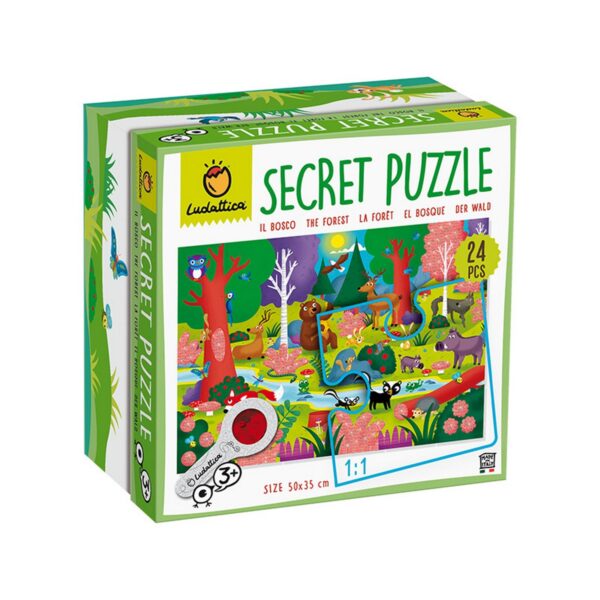 Sectret puzzle - Il Bosco. Incastra le 24 tessere del puzzle e costruisci lo scenario del bosco misterioso, poi scopri i suoi segreti con speciale lente in dotazione! Contenuto: Puzzle 24 pezzi 35 x 50 cm, lente. Età: 3+
