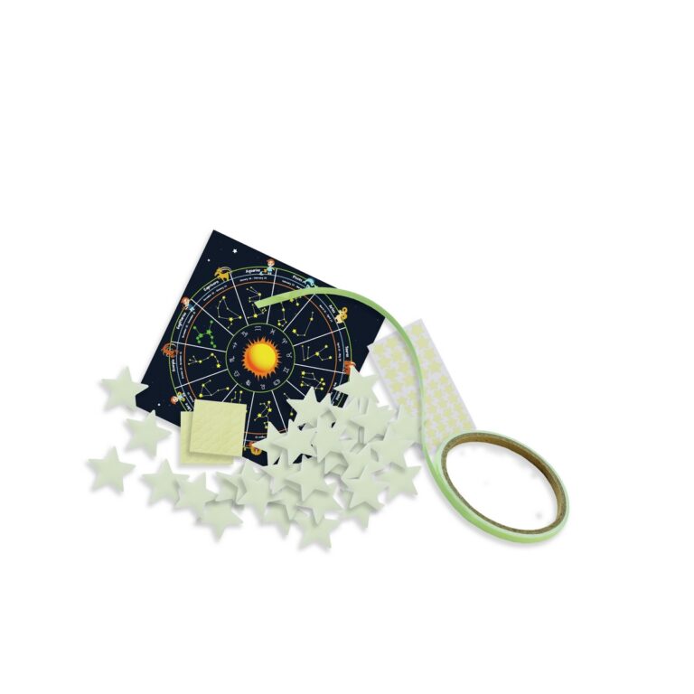 SES Creative Explore Segni zodiacali luminosi. Con questo set di segni zodiacali luminosi potrai trasformare le pareti della tua cameretta in una notte stellata. Crea la costellazione per il tuo segno dello zodiaco o per quello di qualcun altro, e impara tutto sullo zodiaco. Grazie allo speciale effetto fluorescente, le stelle prenderanno vita di notte! Questo set contiene varie stelle adesive e nastro adesivo fluorescente che potrai attaccare alla parete. Usa le istruzioni per creare facilmente le costellazioni dei dodici segni zodiacali. Contenuto della confezione: 40 stelle di plastica fluorescenti; 46 stelle adesive fluorescenti; 3 metri di nastro adesivo fluorescente; Istruzioni con informazioni sullo zodiaco. Età: 5+