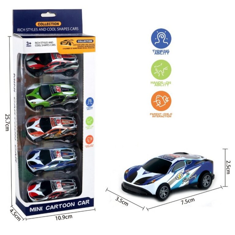 Ogni confezione contiene cinque auto da corsa con un vivace design, caratterizzate da colori brillanti e dettagli accattivanti.
