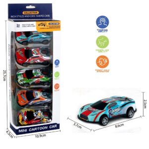Ogni confezione contiene cinque auto da corsa con un vivace design, caratterizzate da colori brillanti e dettagli accattivanti.