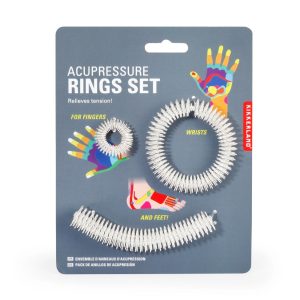 Lasciati avvolgere dal benessere con il set di 3 anelli per massaggio di digitopressione Kikkerland. Questi pratici anelli, di diverse dimensioni, sono progettati per massaggiare delicatamente i punti di pressione sui polsi, dita e piedi, aiutandoti a ridurre lo stress, migliorare la concentrazione e favorire il rilassamento.