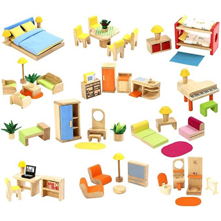 Un set completo di mobili in legno per casetta delle bambole. Contiene: un letto matrimoniale con testiera mobile, materasso e coperta, un letto a castello con due materassi singoli e coperte abbinate, un armadio, un mobile contenitore con due cassetti, una specchiera con sgabello, due moduli letto trasformabili, un letto panca, un pianoforte con panca, una scrivania con sedia, un computer portatile, una libreria con una serie di libri, un mobile lavabo con specchio, un wc, un box doccia, un portasciugamani con asciugamano, un tavolo da pranzo con quattro sedie , una credenza, un frigorifero, un angolo cottura con piano cottura, lavello e mensole, una lavatrice, un forno a microonde, un divano con due poltrone, uno sgabello, due tavolini, un televisore, due lampade da terra, due grandi lampade da tavolo.