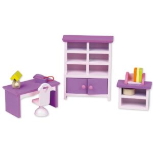 Accessori in legno per casetta delle bambole. Il set comprende: scrivania, armadio e mobiletto.