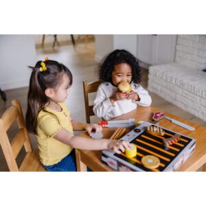 Set Barbecue e griglia. Scalda l'immaginazione accendendo questo barbecue con tutto il necessario per un fantastico banchetto! Proprio come quello dei grandi! Il set include hotdog, hamburger, pollo, bistecca, costolette, ortaggi, granturco e tante salse gustose, pratici utensili, tovaglietta e altro ancora. Il BBQ è la robusta scatola in cartone stampato e gli alimenti sono in legno. Età: 3+