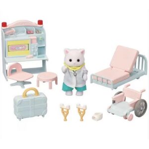 La confezione contiene tutto l’occorrente per allestire un vero studio medico: una postazione da visita con sedia, letto regolabile, sedia a rotelle e una completa dotazione di strumenti come stetoscopio, siringhe, termometro, medicinali e un calco in gesso che può essere applicato alle figure dei bambini Sylvanian. Tutti gli accessori possono essere comodamente riposti nella valigetta del dottore inclusa nel set.