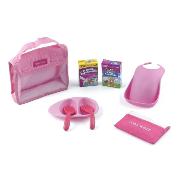 Accessorio per bambole - set per la pappa. Il set include: una borsa, un piattino, una forchetta, un cucchiaio, una bavaglia in plastica, salviettine e due brik gioco. Età: 3+