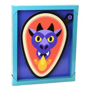 Scudo e spada di legno con un drago sputa fuoco