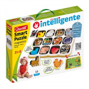 Un nuovissimo puzzle magnetico double-face per i più piccoli. Da un lato, 12 simpatici animali prima da riconoscere e poi da incastrare, ciascuno nella propria giusta impronta; si prendono in mano facilmente per l’alto spessore dei pezzi, e poi, magicamente, rimangono attaccati alla tavoletta grazie alla calamita. Dall’altro lato, invece, la tavoletta diventa una lavagna magnetica coloratissima che serve da sfondo agli animali, ora liberamente posizionabili, per inventare fantastiche storie sempre nuove e diverse. I disegni molto semplici, ma altamente evocativi per l’immaginazione del bambino, costruiscono storie dotate di senso e significato che non solo stimolano la sua fantasia ma suggeriscono anche qualcosa di più profondo. Età : 18m+