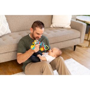Il massaggiagengive in silicone e l’anello in plastica permettono al bambino di esplorare diverse superfici con mani e bocca, incoraggiando la scoperta e il gioco causa-effetto. La grafica ad alto contrasto sostiene lo sviluppo visivo, mentre le dimensioni compatte lo rendono perfetto da fissare ai passeggini o da portare nella borsa per il gioco in movimento.