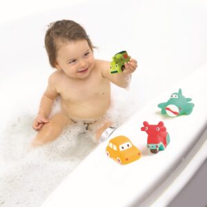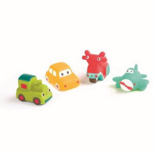 Ci sono un treno, una macchina, una moto e un aeroplano, quattro piccoli compagni colorati che renderanno ogni bagnetto una vera festa piena di risate.