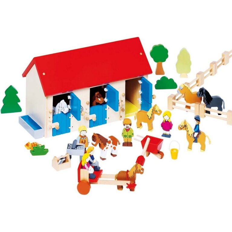 Stalla in legno - Ore di gioco garantite con questa coloratissima stalla in legno del marchio Goki. Questa stalla è composta da 134 pezzi e contiene una moltitudine di accessori, come: stalla, cavalli, paddock, giostra, percorso ad ostacoli, carretto, fabbro e anche minuteria come: spazzole, pinze e ferri di cavallo - Dimensioni: L: 23,6 x P: 9,1 x A: 14,3 cm - Età: 3+