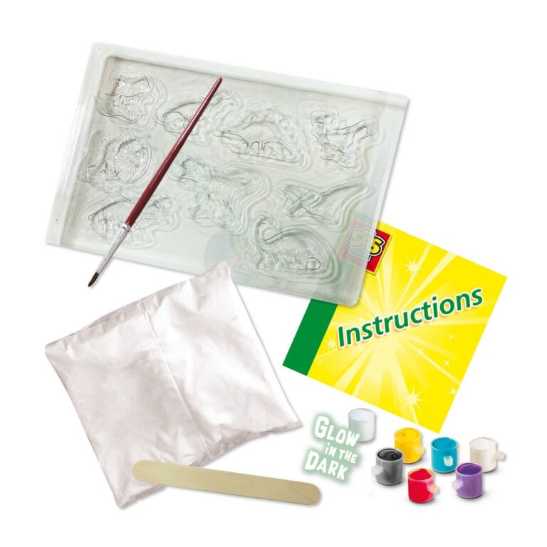 Mescola il gesso con poca acqua, versa negli stampi e lasciare asciugare per 1 giorno. Successivamente dipingi i dinosauri come più ti piace. Il colore Glow in the Dark fa brillare i dinosauri al buio!
