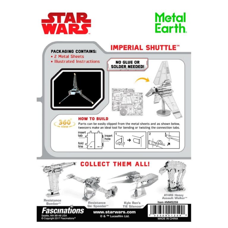 Stimola l'immaginazione con Metal Earth. I modellini MetalEarth sono realizzati in lamiera di acciaio di alta qualità. Ciascun modello si caratterizza per dettagli sorprendenti, con pezzi ritagliati da una o più lamiere di acciaio quadrate (10,16 cm circa). Istruzioni facili da seguire sono incluse in ciascun kit. Basta tagliare i pezzi e piegare le linguette sui punti di giunzione corrispondenti. Non serve né colla né lega per saldare! Numero di fogli: 2 fogli - Difficoltà : Moderata - Dimensioni modellino assemblato: 12.7 x 6.4 x 11.1 cm