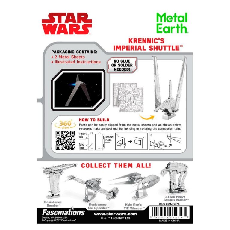 Stimola l'immaginazione con Metal Earth. I modellini MetalEarth sono realizzati in lamiera di acciaio di alta qualità. Ciascun modello si caratterizza per dettagli sorprendenti, con pezzi ritagliati da una o più lamiere di acciaio quadrate (10,16 cm circa). Istruzioni facili da seguire sono incluse in ciascun kit. Basta tagliare i pezzi e piegare le linguette sui punti di giunzione corrispondenti. Non serve né colla né lega per saldare! Numero di fogli: 2 fogli - Difficoltà : Moderata - Dimensioni modellino assemblato: 7.5 x 5.2 x 11.6 cm