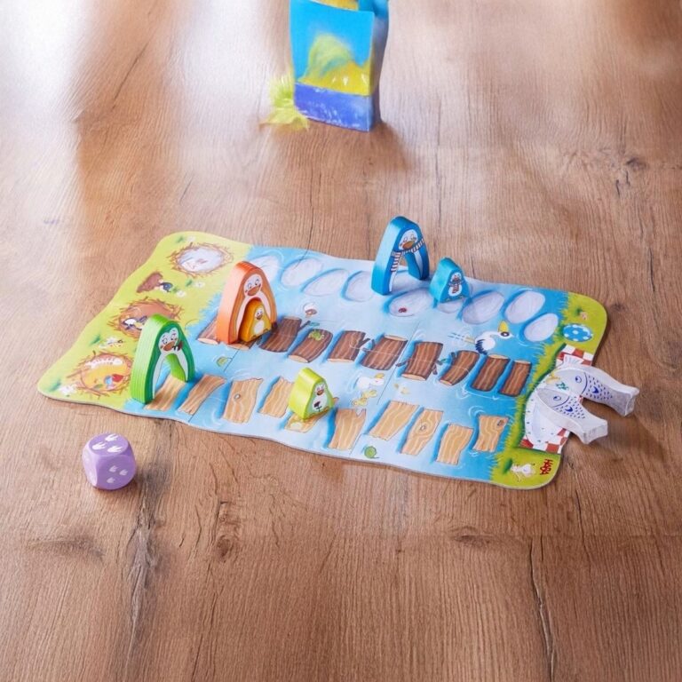 Questo adorabile gioco introduce i più piccoli al mondo dei giochi da tavolo con regole semplici e facili da seguire. I protagonisti sono sei grandi pinguini di legno, sagomati per essere perfettamente afferrati dalle manine dei bambini: tre mamme pinguino e i loro tre teneri cuccioli. La missione? Aiutare queste simpatiche famiglie di pinguini a raggiungere la terraferma dalla loro isola, dove li attendono deliziosi pesci!