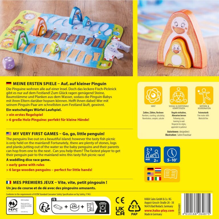 Prepara i tuoi piccoli esploratori a un'avventura sul ghiaccio con "Su, su, piccolo pinguino", il delizioso primo gioco di dadi di HABA, perfetto per bambini dai 2 anni in su e parte dell'amata serie "I miei primi giochi".