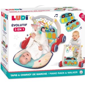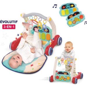 Questo giocattolo evolutivo 3-in-1 accompagna il tuo bambino dalla nascita ai primi passi, trasformandosi da un morbido tappetino da gioco a un tavolino di attività rimovibile e infine a un carrello primi passi sicuro.