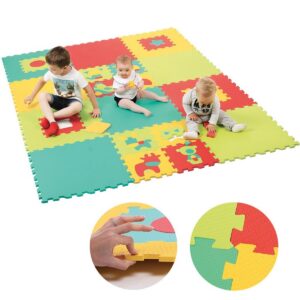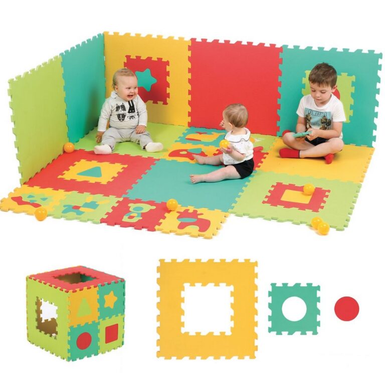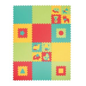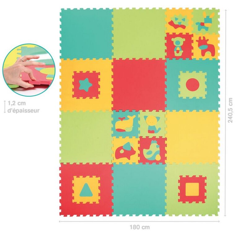 Grande tappeto puzzle in gommapiuma composto da 22 tessere puzzle di diverse dimensioni. Isola il bambino dal freddo e assorbe gli urti. Gioco ad incastro con tessere, forme geometriche e animali. Unite l'una all'altra, le 22 tessere in gommapiuma offrono al bambino un morbido tappeto da gioco di 180x240 cm, ideale per gattonare o giocare con i propri giocattoli preferiti. Le piastrelle si incastrano bene tra loro e il loro spessore (1,2 cm) garantirà comfort al bambino. Il tappeto può essere utilizzato all'interno come tappetino da gioco e all'aperto su una superficie piana non scivolosa. Dimensioni di una lastra: 60 x 60 x 1,2 cm
