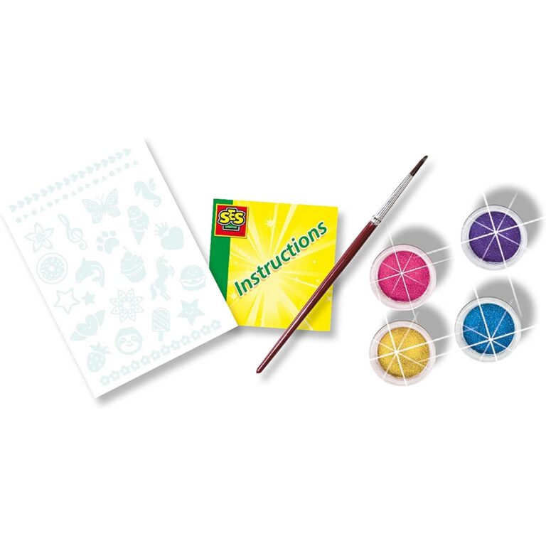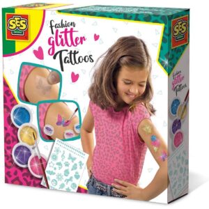 Crea i tuoi tatuaggi trendy brillantinati con questo set di SES Creative. Applica gli adesivi trasparenti fronte-retro sulla pelle e tampona i brillantini con il pennello sulla parte adesiva. Personalizza i tuoi tatuaggi sperimentando con colori diversi di brillantini o prova anche a mescolarli. Testati per uso cosmetico e facili da rimuovere dalla pelle. Età consigliata: 5+