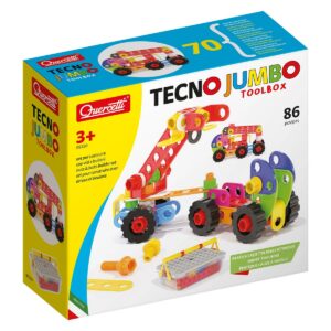 Nella cassetta degli attrezzi di Tecno Jumbo Toolbox ci trovi tutto quanto occorre per costruire un mondo fatto di camion, ruspe, gru o qualsiasi altra cosa ti venga in mente.