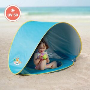 Tenda piscina da spiaggia multifunzione - Facile da maneggiare, la tenda piscina si apre in un batter d'occhio, basta un buco nella sabbia! Aggiungi un po' di acqua di mare o acqua limpida e il gioco è fatto! La tenda permette ai bambini di giocare protetti dai dannosi raggi del sole grazie al suo tessuto in poliestere anti UV 50. Consegnato con 1 borsa + 4 picchetti di fissaggio a terra. Dimensioni della Tenda piscina: 115 x 70 x 80 cm. Dimensioni vasca: 66 x 44 cmx16cm profondità. Età: +10M