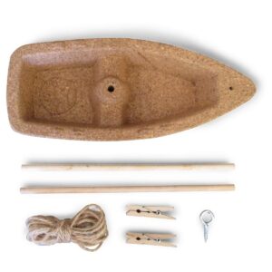 Kit di costruzione per barchetta in sughero. Facilissima da montare. Ottima capacità di galleggiamento. Può essere personalizzata con materiali trovati in natura. Materiale: sughero,sisal,legno,acciaio. Età: 5+