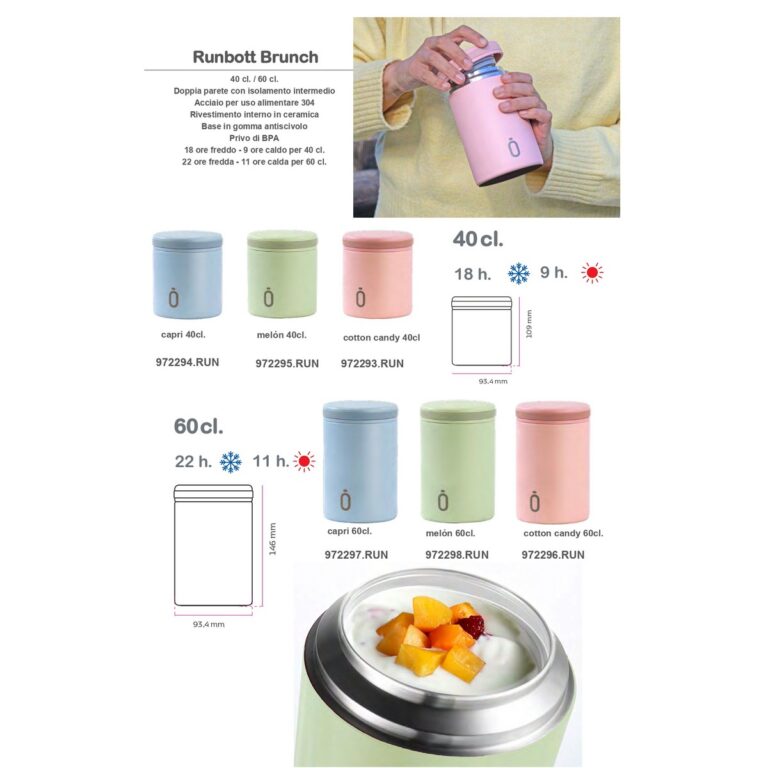 Il Runbott Brunch è il contenitore ideale per portare i tuoi pasti preferiti ovunque tu vada, mantenendoli alla temperatura perfetta per ore. Grazie al suo design funzionale e alla sua tecnologia di isolamento all'avanguardia, il tuo pranzo sarà sempre caldo o freddo al punto giusto.